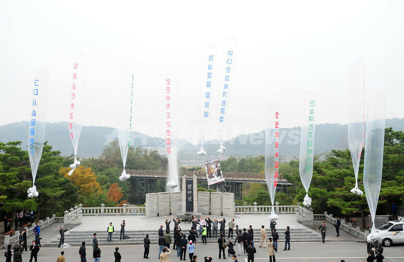 【10月11日 AFP】朝鮮半島を南北に隔てる軍事境界線に近い韓国・坡州(Paju)の臨津閣(Imjingak)公園で10日、反北朝鮮団体のメンバー70人あまりが、金正日体制を批判するビラ約20万枚を大型風船で北朝鮮に向けて飛ばした。