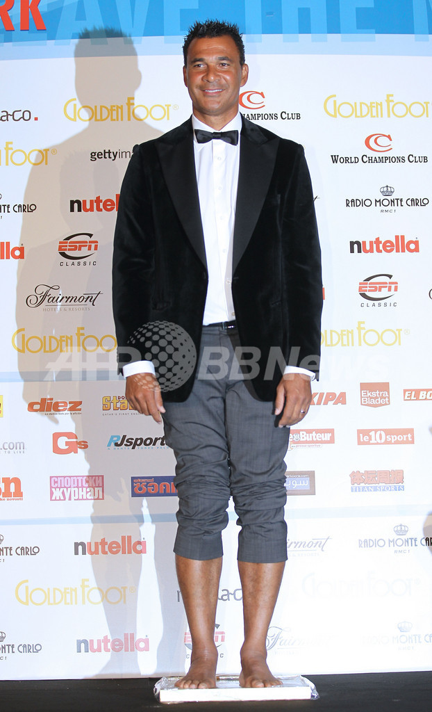 インターナショナル・フットボール・レジェンドに選出され、足型を取るルート・フリット氏(Ruud Gullit、2011年10月10日撮影)。(c)AFP/VALERY HACHE