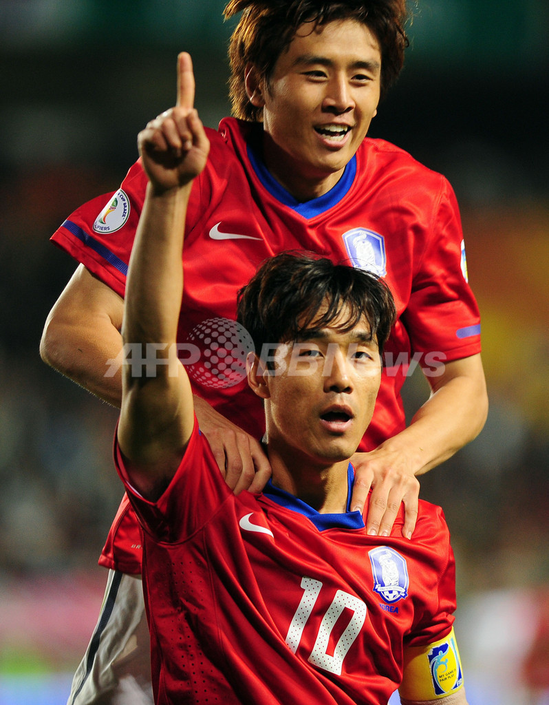 後半5分に先制点を挙げ、チームメイトの具滋哲(ク・ジャチョル、Koo Ja-Cheol、上)に祝福される韓国の朴主永(Park Chu-Young、パク・チュヨン、2011年10月11日撮影)。(c)AFP/PARK JI-HWAN