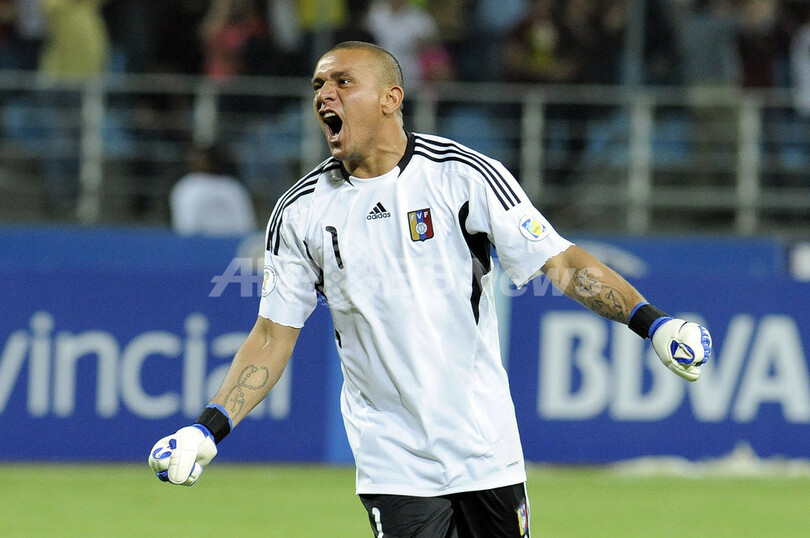 チームが得点に歓喜するベネズエラのGKレニー・ベガ(Renny Vega、2011年10月11日撮影)。(c)AFP/Leo RAMIREZ