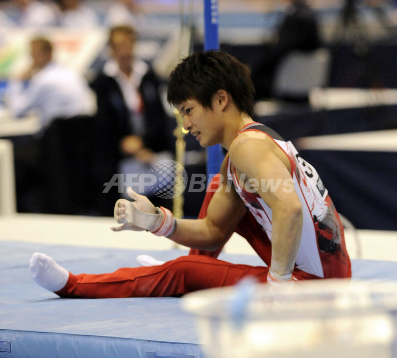 鉄棒で落下した田中佑典(Yusuke Tanaka、2011年10月12日撮影)。(c)AFP/TOSHIFUMI KITAMURA