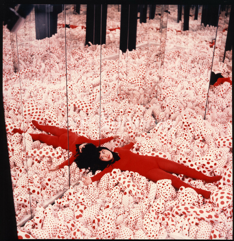 写真は、回顧展に出展された草間さん1965年の作品「 Infinity Mirror Room Installation – Phalli’s Field, Floor Show」。(c)Relaxnews/Yayoi Kusama Studio, Tokyo