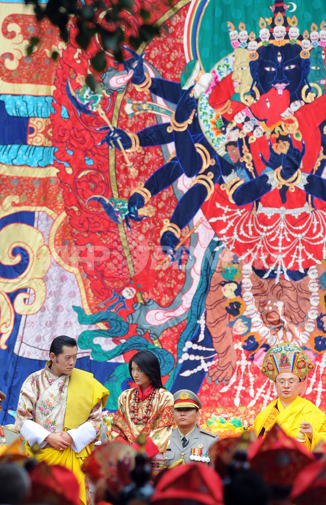 結婚式は17世紀に建立された僧院でチベット仏教にのっとって行われ、儀式の最後にワンチュク国王がペマさんに王妃の冠をかぶせた。