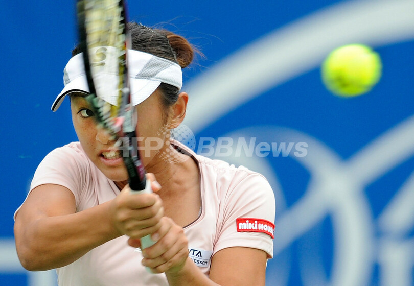 リターンを打つ土井美咲(2011年10月13日撮影)。(c)AFP/Toru YAMANAKA