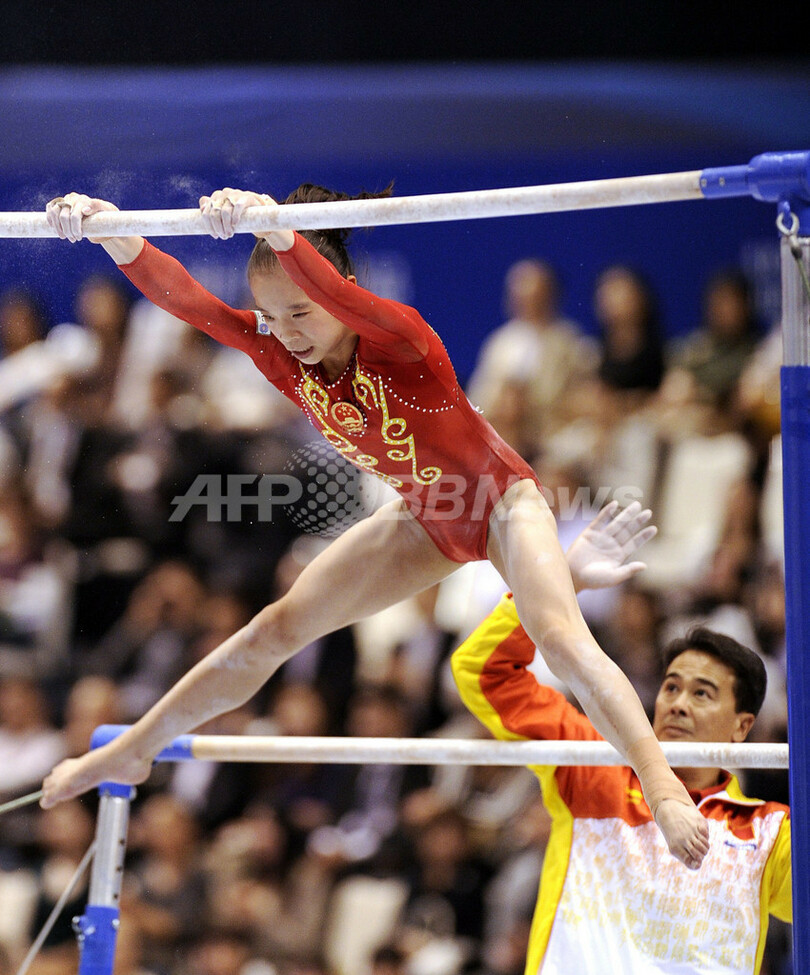 段違い平行棒に臨む姚金男(2011年10月13日撮影)。(c)AFP/Kazuhiro NOGI