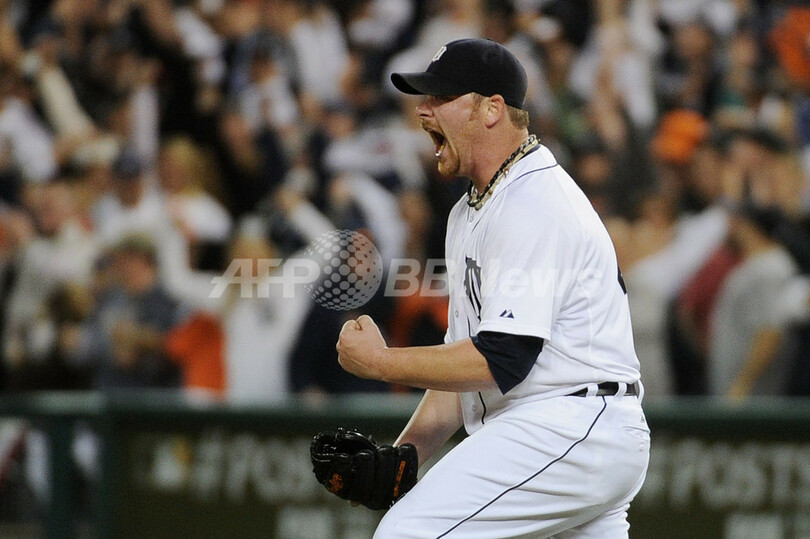 試合に勝利し歓喜するタイガースのフィル・コーク(Phil Coke、2011年10月13日撮影)。(c)AFP/Getty Images/Harry How