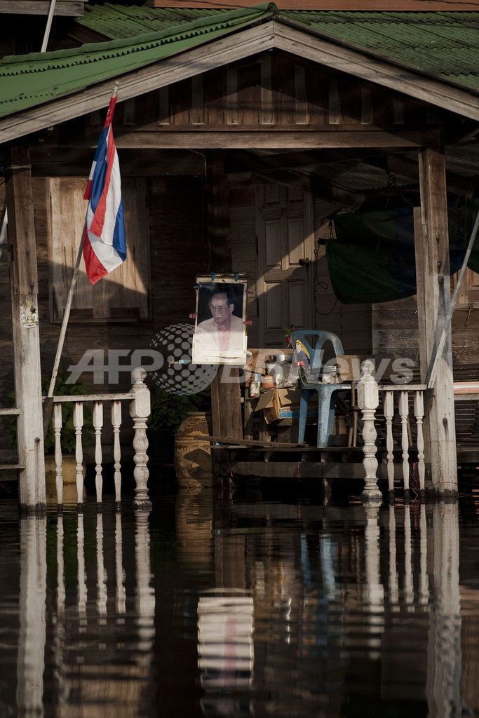 写真は、タイ国旗が掲げられたバンコクのチャオプラヤ(Chaopraya)川近くの家(2011年10月14日撮影)。(c)AFP/Nicolas ASFOURI