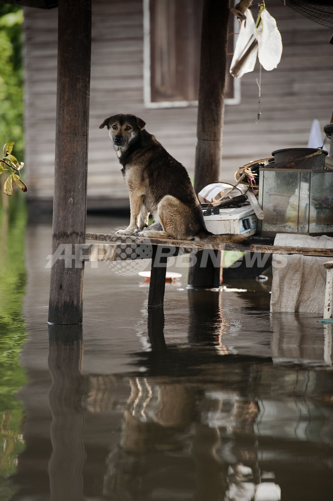 写真は、バンコク・チャオプラヤ川近くで、浸水した家の飼い犬(2011年10月14日撮影)。(c)AFP/Nicolas ASFOURI