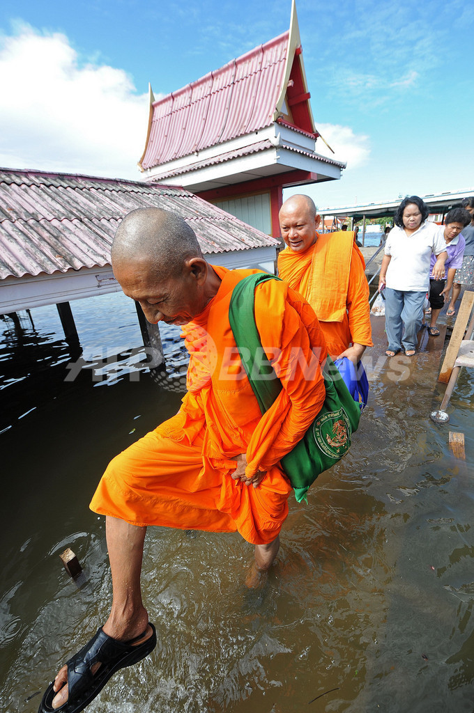 写真は、洪水に見舞われたバンコク南方のノンタブリ(Nonthaburi)県で、冠水した道路を歩く僧侶ら(2011年10月15日撮影)。(c)AFP/Pornchai KITTIWONGSAKUL