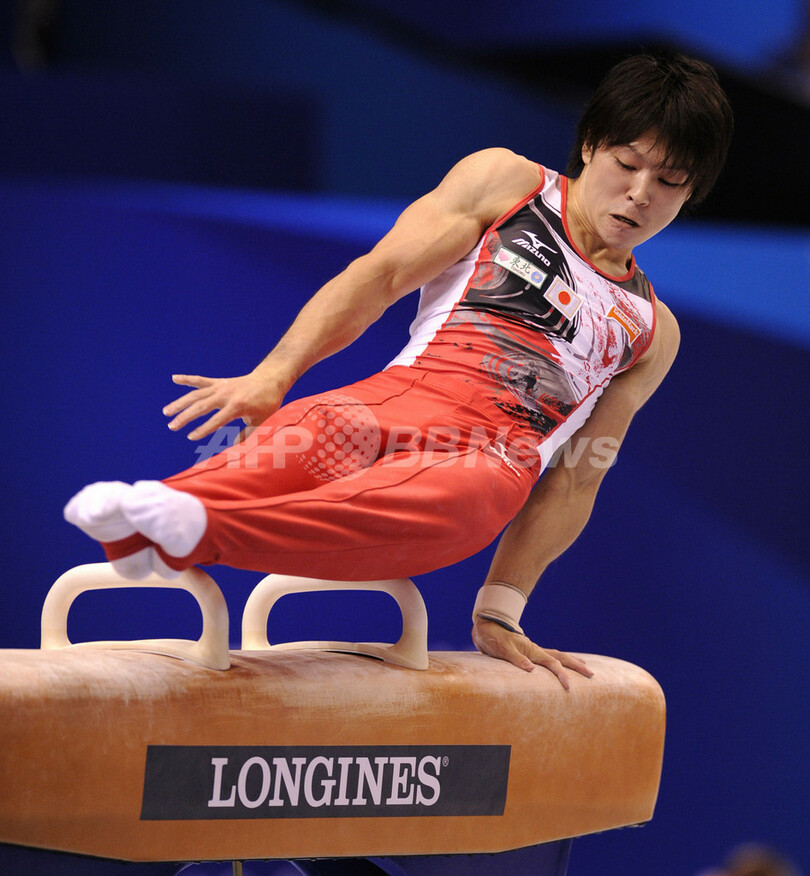 あん馬の演技に臨む内村航平(2011年10月15日撮影)。(c)AFP/KAZUHIRO NOGI
