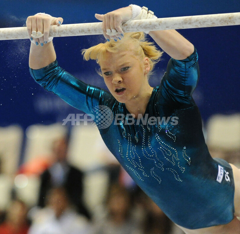 段違い平行棒に臨むタチアナ・ナビエワ(2011年10月15日撮影)。(c)AFP/TOSHIFUMI KITAMURA