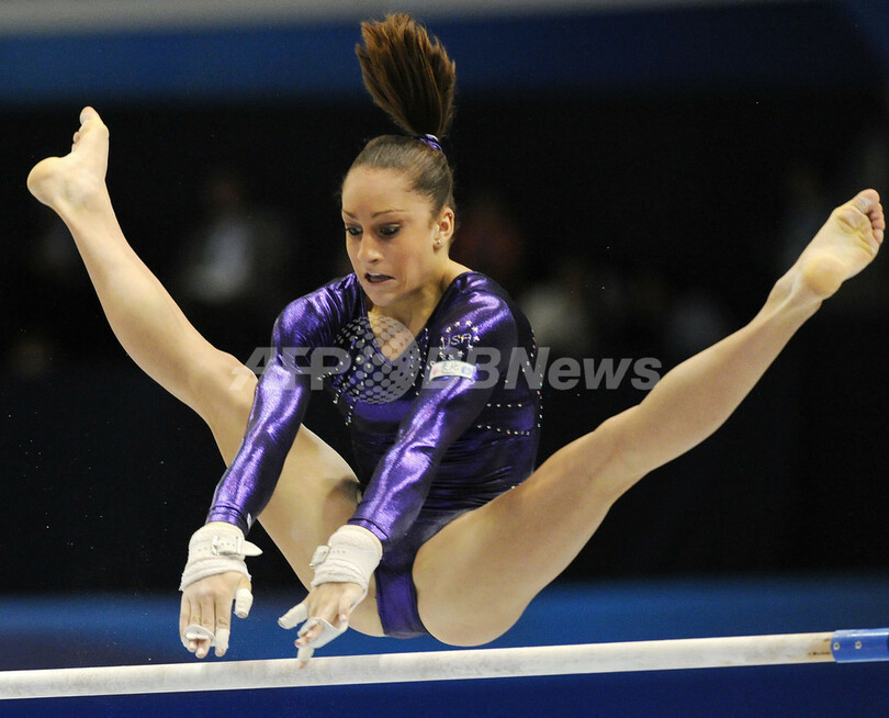 段違い平行棒の演技に臨むジョルディン・ウィーバー(2011年10月15日撮影)。(c)AFP/TOSHIFUMI KITAMURA