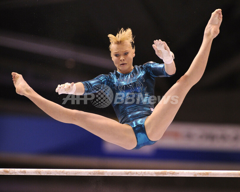 段違い平行棒の演技に臨むタチアナ・ナビエワ(2011年10月15日撮影)。(c)AFP/KAZUHIRO NOGI