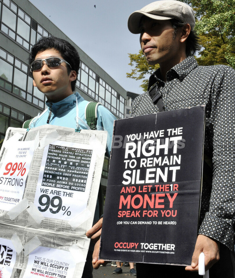 【10月15日 AFP】都内で15日、米国で始まった経済格差への抗議行動「Occupy Wall Street(ウォール街を占拠せよ)」に呼応する集会やデモが行われた。(c)AFP