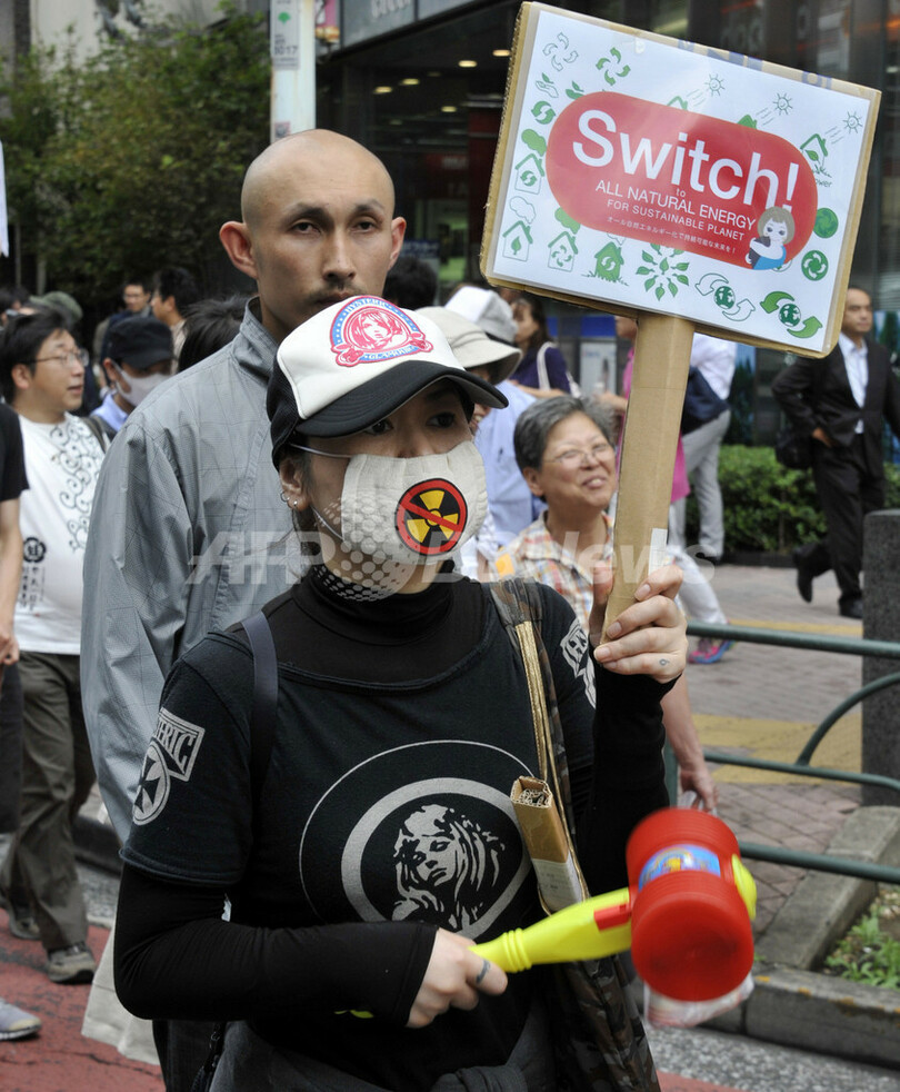 写真は、格差抗議デモに参加する原発に反対する女性(2011年10月15日撮影)。(c)AFP/Yoshikazu TSUNO