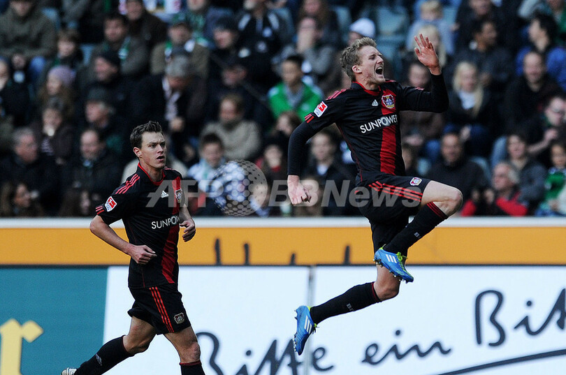 後半42分に同点ゴールを決め歓喜するバイヤー・レバークーゼンのアンドレ・シュールレ(Andre Schuerrle、右、2011年10月15日撮影)。(c)AFP/PATRIK STOLLARZ