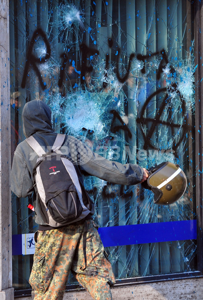 【10月16日 AFP】イタリアの首都ローマ(Rome)で15日、強欲な企業や政府の支出削減に抗議するデモが開かれ、デモ参加者の一部が暴徒化して銀行建物を壊し、軍施設に放火した。同日に世界各地で開かれた抗議デモの中で、最悪の暴動となった。