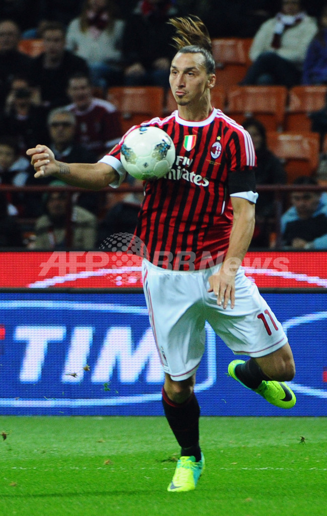 ボールをトラップするACミランのズラタン・イブラヒモビッチ(Zlatan Ibrahimovic、2011年10月15日撮影)。(c)AFP/OLIVIER MORIN