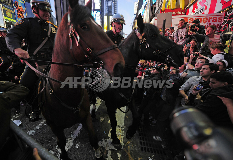 【10月16日 AFP】企業の強欲さに抗議するデモが世界各地で行われた15日、ニューヨーク(New York)では、タイムズスクエア(Times Square)でデモ隊と騎馬警官隊が衝突し、市内で少なくとも88人が逮捕された。