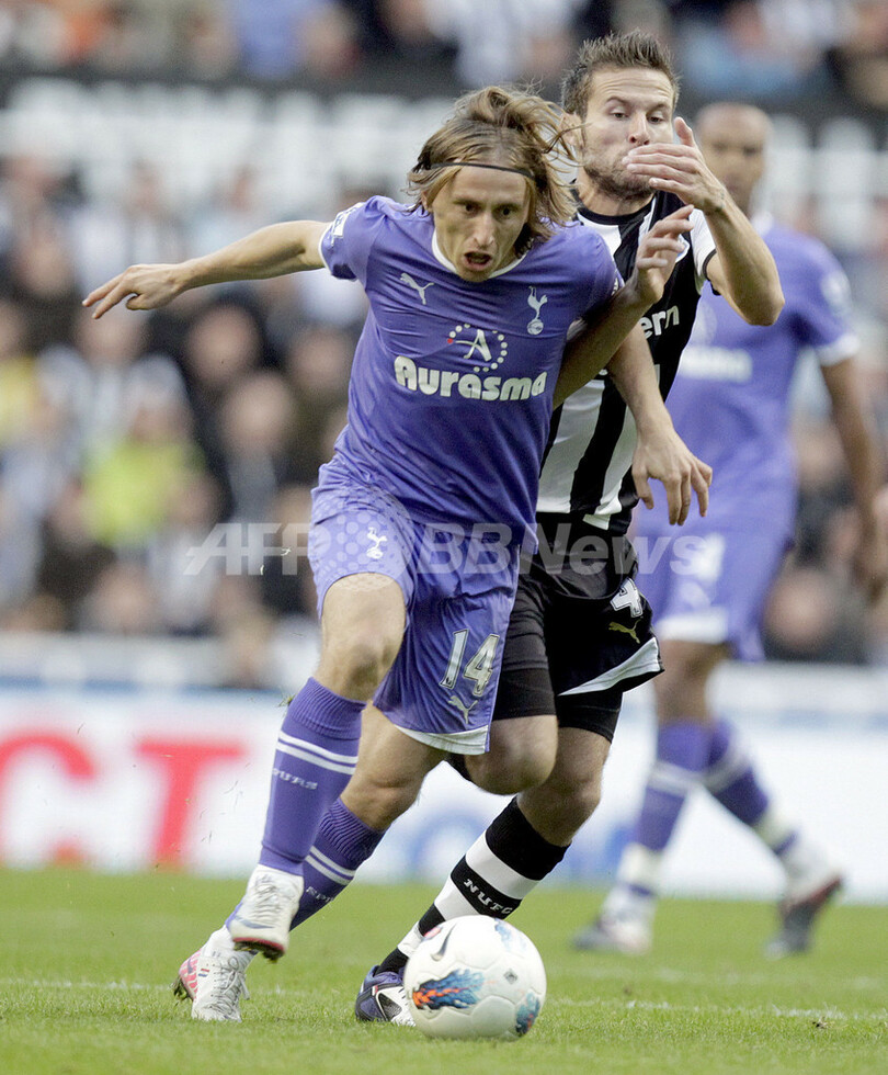 ニューカッスルのヨハン・カバイェ(Yohan Cabaye、右)のチェックを受けるトッテナム・ホットスパーのルカ・モドリッチ(Luka Modric、2011年10月16日撮影)。(c)AFP/GRAHAM STUART