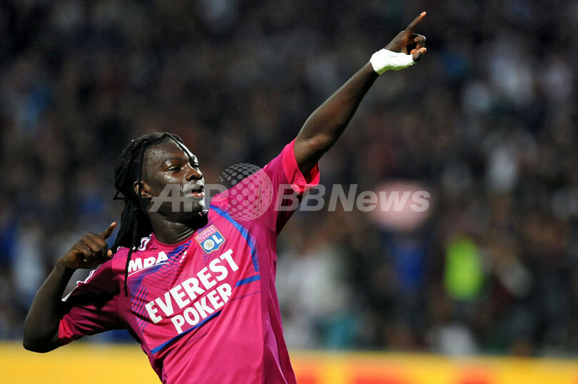 前半28分に追加点を挙げ、喜ぶオリンピック・リヨンのバフェタンビ・ゴミス(Bafetimbi Gomis、2011年10月16日撮影)。(c)AFP/PHILIPPE MERLE