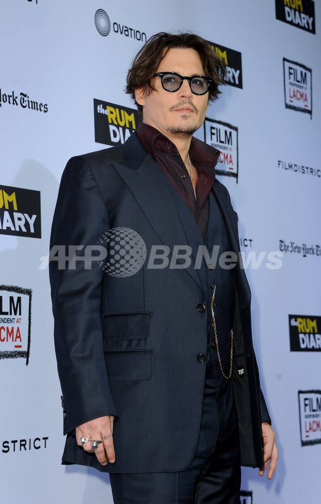 ジョニー・デップ(Johnny Depp)主演の最新映画『The Rum Diary』のプレミア上映会が13日、米ロサンゼルス(Los Angeles)で行われた。写真は、会場に姿を見せたデップ(2011年10月13日撮影)。(c)AFP/Getty Images/Kevin Winter