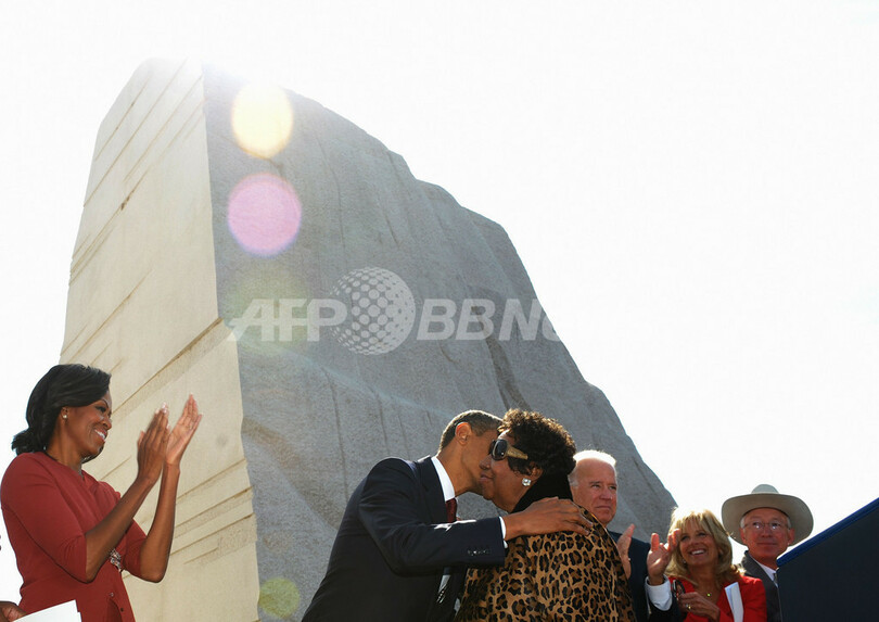 写真は、ナショナルモールの桜の名所、タイダル・ベイスン(Tidal Basin)に完成したキング牧師記念碑の完成式典で、米歌手アレサ・フランクリン(Aretha Franklin)とキスを交わすオバマ大統領(2011年10月16日撮影)。(c)AFP/Mandel NGAN