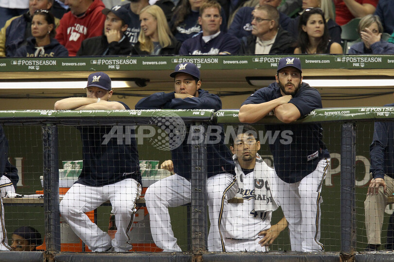 ダグアウトから戦況を見守るミルウォーキー・ブルワーズの斎藤隆(Takashi Saito、右から2人目、2011年10月16日撮影)。(c)AFP/Getty Images/Christian Petersen
