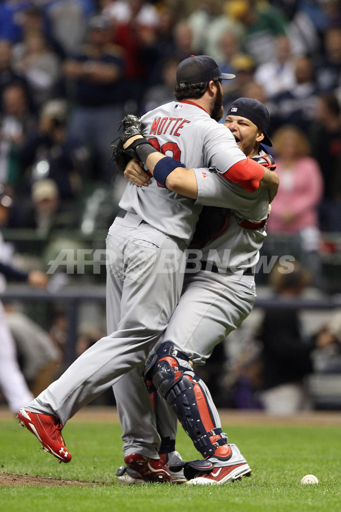 優勝を決め、捕手ヤディアー・モリーナ(Yadier Molina、右)と抱き合って歓喜するセントルイス・カージナルスのジェイソン・モット(Jason Motte、2011年10月16日撮影)。(c)AFP/Getty Images/Christian Petersen