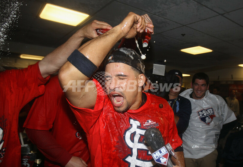 ロッカールームでシャンパンファイトを行い、優勝を喜ぶセントルイス・カージナルスのラファエル・ファーカル(Rafael Furcal、2011年10月16日撮影)。(c)AFP/Getty Images/Jonathan Daniel