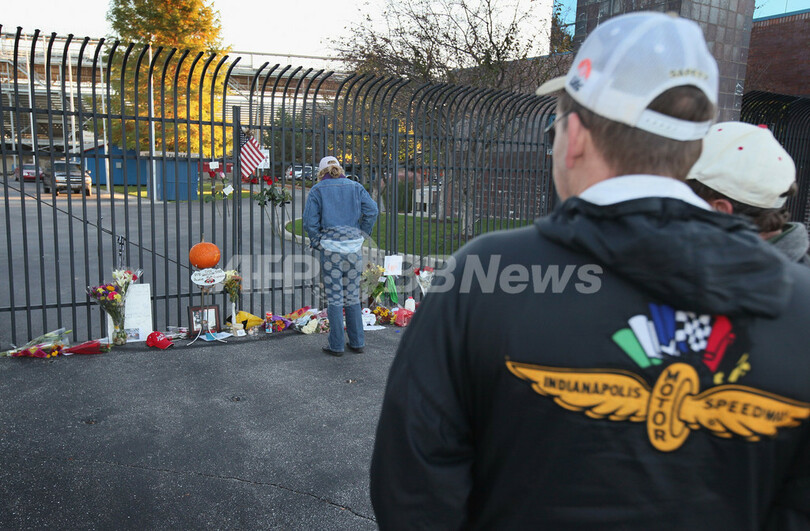 花が手向けられたインディアナポリス・モーター・スピードウェイの門前に立つファン(2011年10月17日撮影)。(c)AFP/Getty Images/Scott Olson