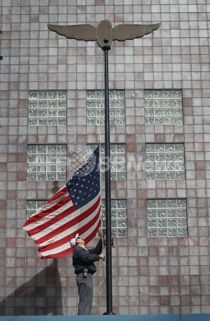 米国旗が半旗にされたインディアナポリス・モーター・スピードウェイの国旗掲揚台(2011年10月17日撮影)。(c)AFP/Getty Images/Scott Olson