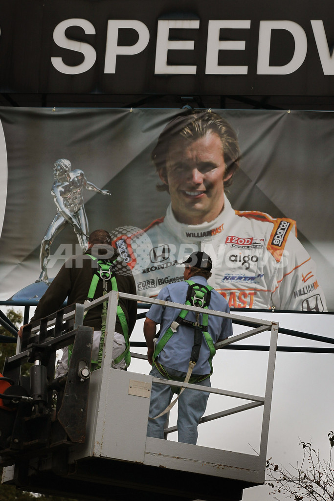インディアナポリス・モーター・スピードウェイの門にダン・ウェルドンの写真を掲げる作業員(2011年10月17日撮影)。(c)AFP/Getty Images/Scott Olson
