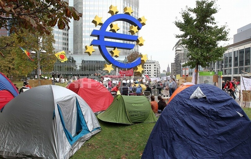写真は、独フランクフルトの欧州中央銀行(European Central Bank、ECB)前にテントを張る座り込み集会の参加者たち(2011年10月17日撮影)。(c)AFP/DANIEL ROLAND