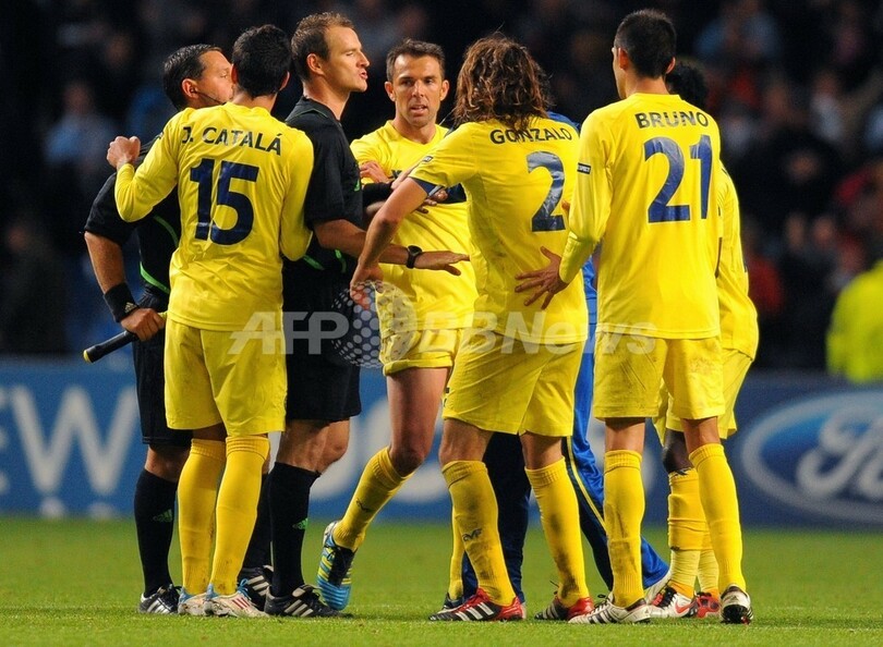 試合終了後、審判に抗議するビジャレアルの選手(2011年10月18日撮影)。(c)AFP/ANDREW YATES