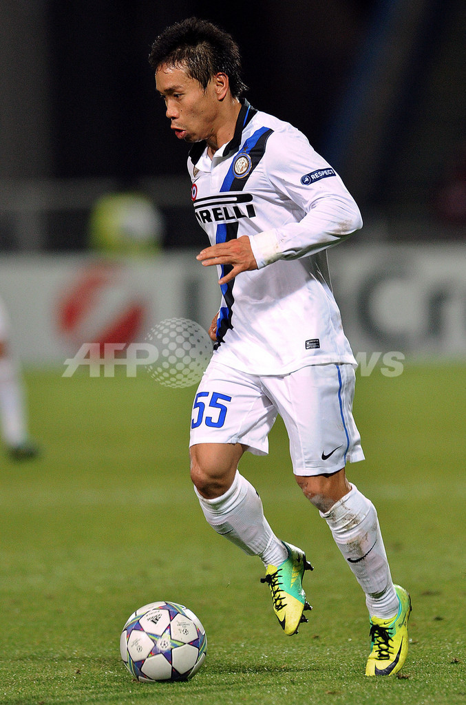 ボールをキープするインテルの長友佑都(Yuto Nagatomo、2011年10月18日撮影)。(c)AFP/PHILIPPE HUGUEN