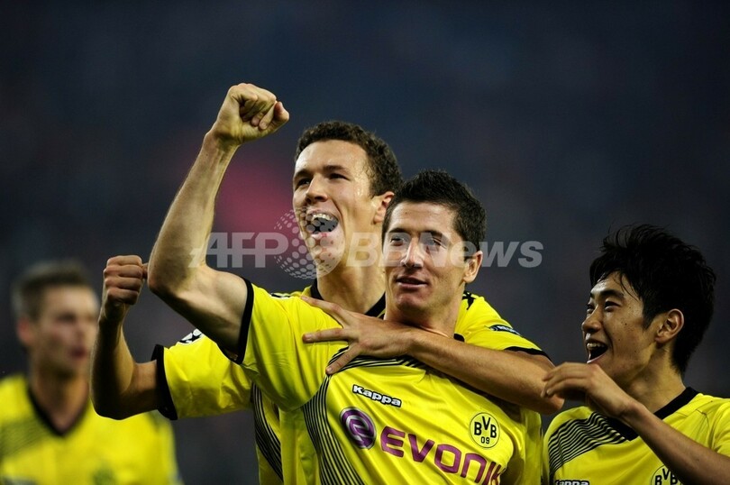 前半26分に同点ゴールを決め、チームメイトとともに歓喜するボルシア・ドルトムントのロベルト・レワンドフスキ(Robert Lewandowski、2011年10月19日撮影)。(c)AFP/ARIS MESSINIS