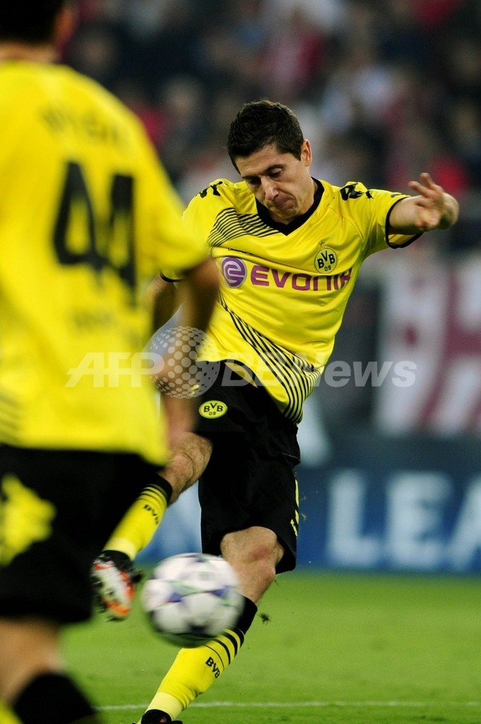 前半26分に同点ゴールを決めるボルシア・ドルトムントのロベルト・レワンドフスキ(Robert Lewandowski、2011年10月19日撮影)。(c)AFP/ARIS MESSINIS