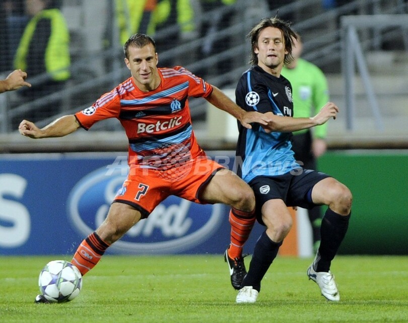 ボールを競るオリンピック・マルセイユのベノワ・シェイル(Benoit Cheyrou、左)とアーセナルのトマス・ロシツキー(Tomas Rosicky、2011年10月19日撮影)。(c)AFP/ANNE-CHRISTINE POUJOULAT