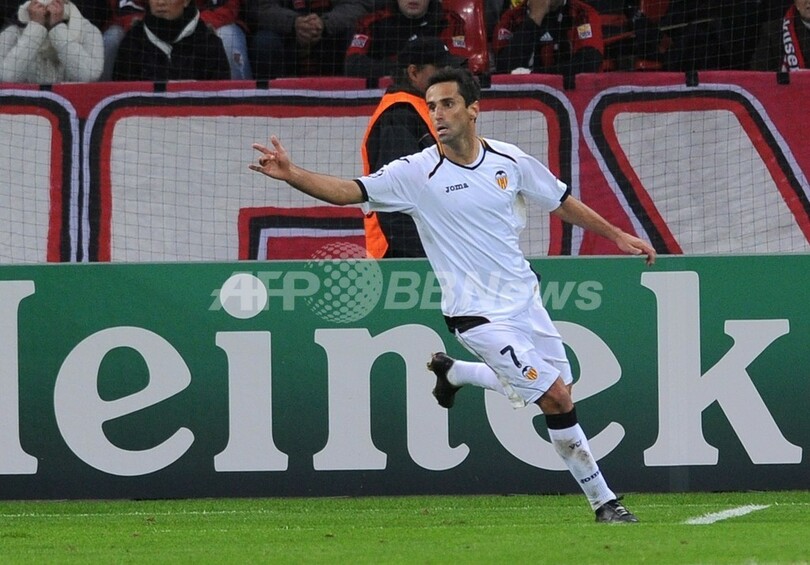 前半24分に先制点を挙げて歓喜するバレンシアのジョナス(Jonas Goncalves Oliveira、2011年10月19日撮影)。(c)AFP/PATRIK STOLLARZ