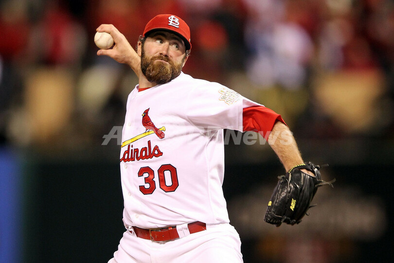9回に登板し、2安打2失点(自責1)で一死も取れずに降板したカージナルスのジェイソン・モット(Jason Motte、2011年10月20日撮影)。(c)AFP/Getty Images/Jamie Squire