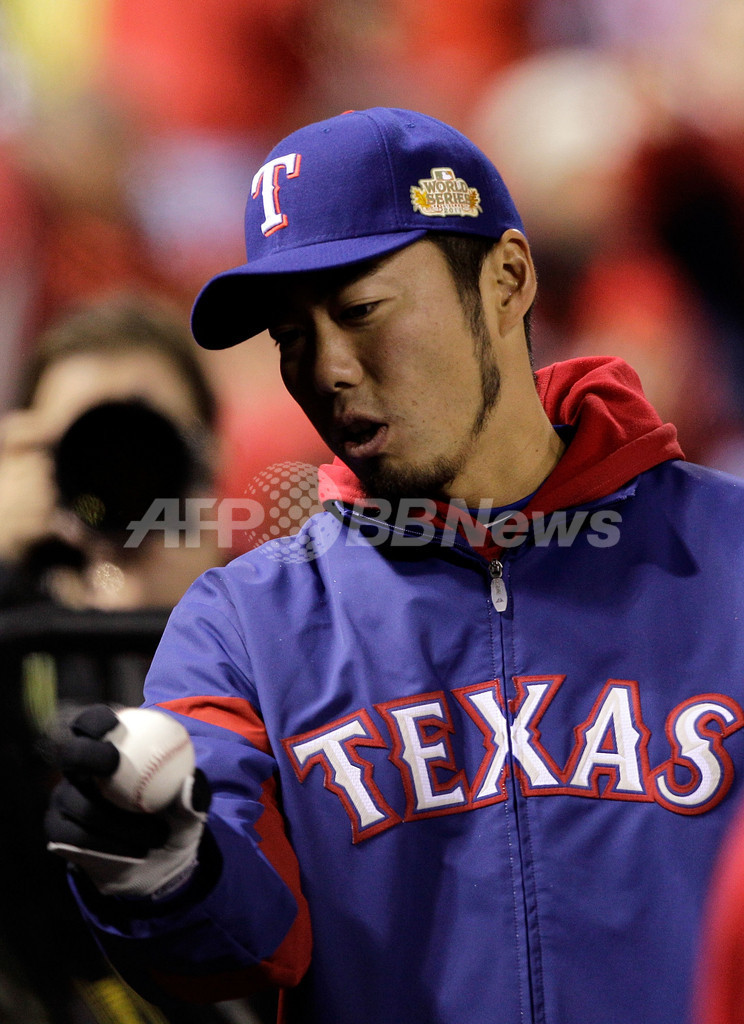 ワールドシリーズの出場登録を外れたレンジャーズの上原浩治(Koji Uehara、2011年10月19日撮影)。(c)AFP/Getty Images/Rob Carr