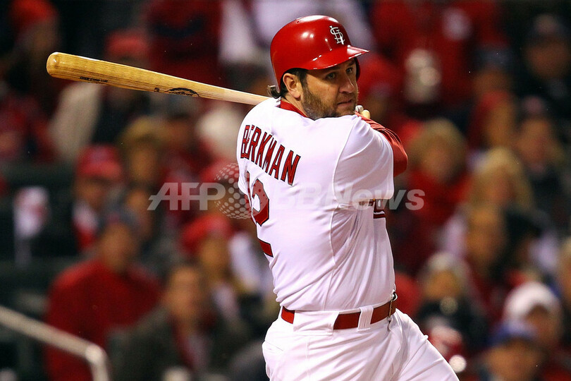 4回に2点適時打を放ったカージナルスのランス・バークマン(Lance Berkman、2011年10月19日撮影)。(c)AFP/Getty Images/Dilip Vishwanat