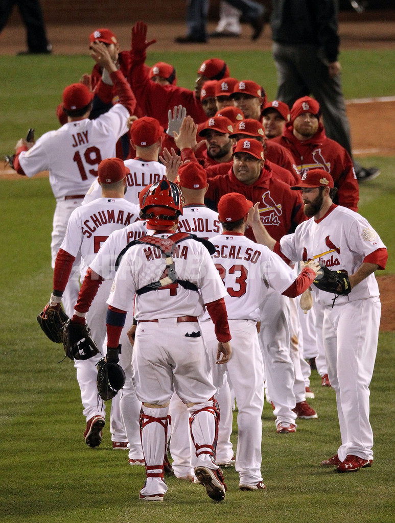 試合に勝利し喜びを分かち合うカージナルスの選手(2011年10月19日撮影)。(c)AFP/Getty Images/Jamie Squire