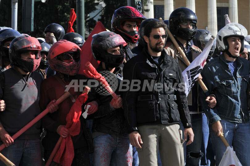 一方、ゼネスト2日目の同日、採決が行われる首都アテネ(Athens)の国会議事堂前のシンタグマ広場(Syntagma Square)には約3万5000人のデモ参加者が集結し、一部が警官隊と衝突。1人が死亡した。