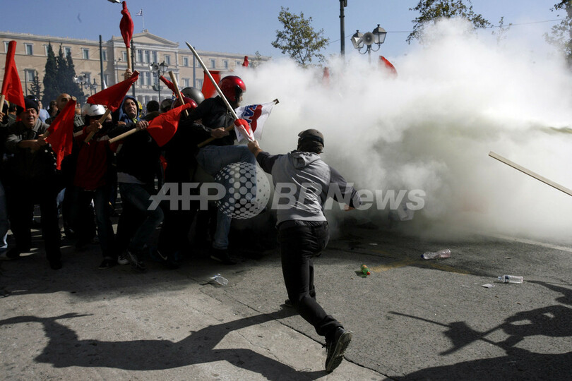 一方、ゼネスト2日目の同日、採決が行われる首都アテネ(Athens)の国会議事堂前のシンタグマ広場(Syntagma Square)には約3万5000人のデモ参加者が集結し、一部が警官隊と衝突。1人が死亡した。