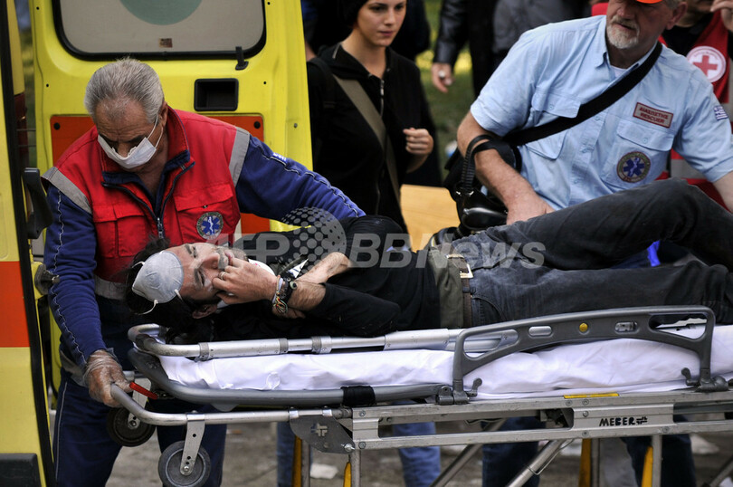 一方、ゼネスト2日目の同日、採決が行われる首都アテネ(Athens)の国会議事堂前のシンタグマ広場(Syntagma Square)には約3万5000人のデモ参加者が集結し、一部が警官隊と衝突。1人が死亡した。