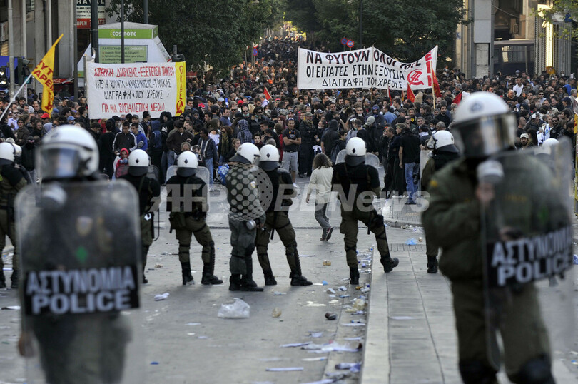 一方、ゼネスト2日目の同日、採決が行われる首都アテネ(Athens)の国会議事堂前のシンタグマ広場(Syntagma Square)には約3万5000人のデモ参加者が集結し、一部が警官隊と衝突。1人が死亡した。