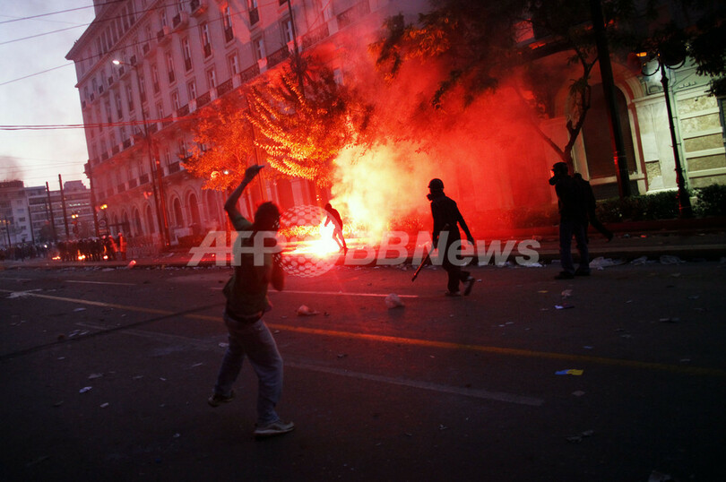 一方、ゼネスト2日目の同日、採決が行われる首都アテネ(Athens)の国会議事堂前のシンタグマ広場(Syntagma Square)には約3万5000人のデモ参加者が集結し、一部が警官隊と衝突。1人が死亡した。