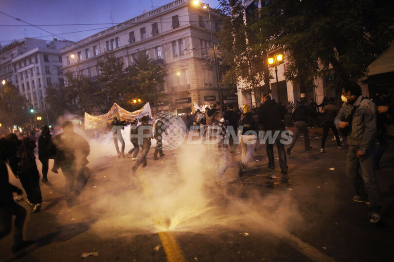 一方、ゼネスト2日目の同日、採決が行われる首都アテネ(Athens)の国会議事堂前のシンタグマ広場(Syntagma Square)には約3万5000人のデモ参加者が集結し、一部が警官隊と衝突。1人が死亡した。